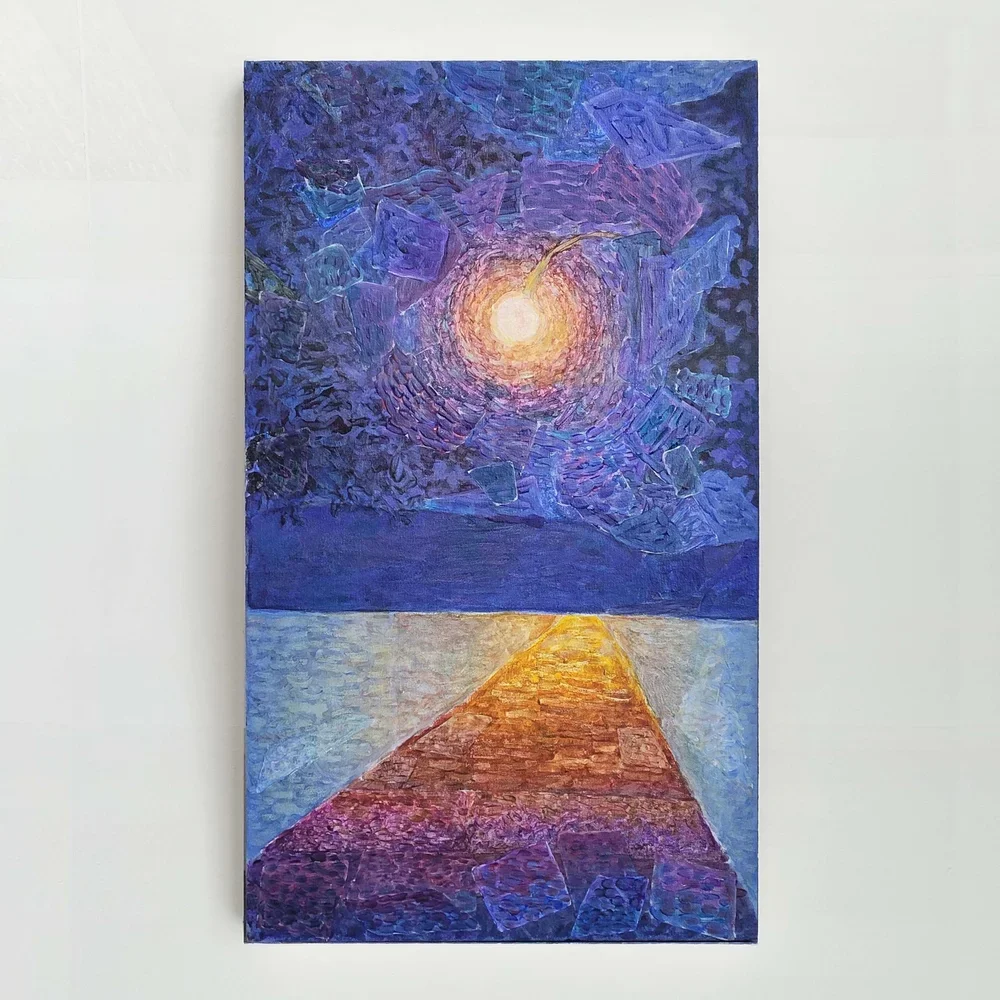 Por outro lado, também estão na mostra obras que se arriscam no sentido material. Entre elas, há uma fresca paisagem em óleo em “Lembrete de Botafogo”, o jogo de altinha banhado por em azul-turquesa de “Começo de FIm de Tarde”, e como ponto final da mostra, a nostálgica “Lembrança de uma velha luz de rua”. A assinatura da obra é a experimentação com textura e a luz, feita de formas diversas: veladuras de cor, subtrações feitas com ferramentas de entalhe de madeira, e visíveis ‘jornadas’ de pintura que geram emendas, remetendo ao afresco da antiguidade. Há sempre um cuidado especial em manter o frescor de cada tela, que requer uma atenção especial ao tempo de secagem e de aplicação.